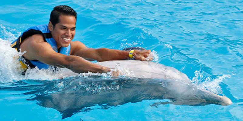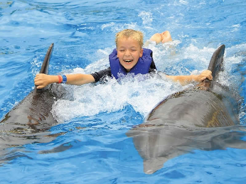 Te daremos un equipo de esnórquel para que conozcas su mundo submarino, también te impulsarán de la planta de los pies mientras estás sobre una tabla boogie para darte un paseo a toda velocidad. Los delfines te saludarán con ternura moviendo sus aletas, te darán besitos, entonarán canciones para ti, te llevarán a pasear sobre su barriguita y los verás saltar y jugar contigo.