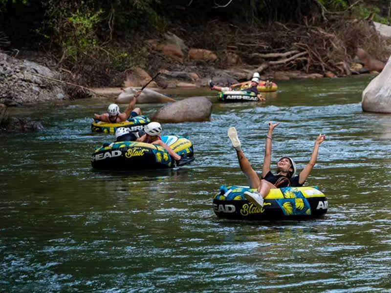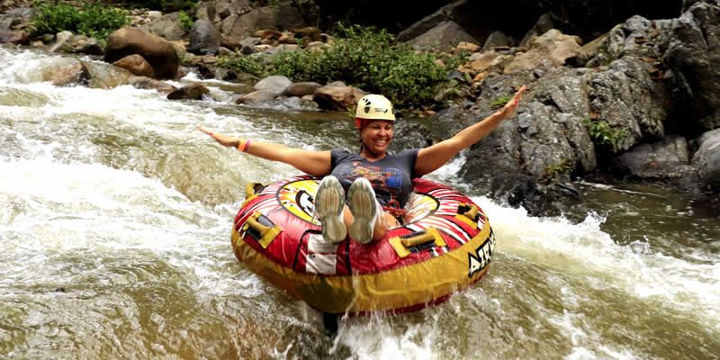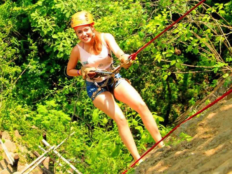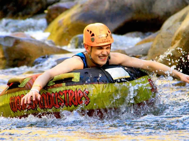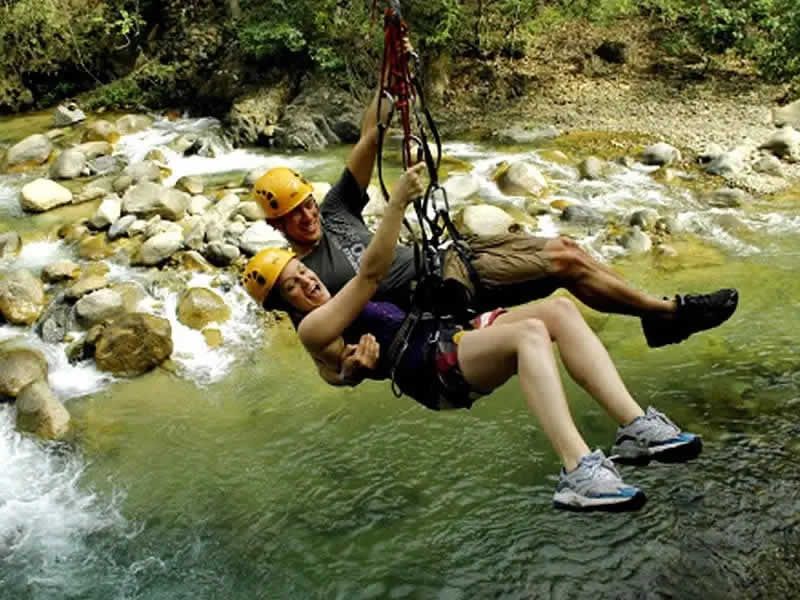 ¡Aventura sin límites! Recorre las montañas en seis tirolesas combinadas con puentes colgantes, rapel de pared, rapel de caída libre, senderos, una liana de Tarzán, desciende sobre el río en balsas inflables y termina a bordo de mulas que harán más ameno tu recorrido montaña arriba.